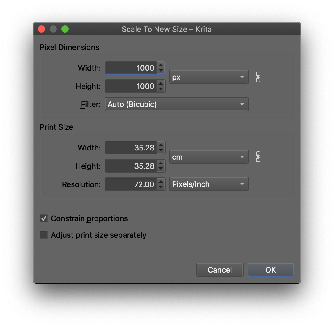 圖片說明:修改前是1000 x 1000 , 解析度(Resolution)是 119,把119修改為72,krita 會自動去調整 Width / Height 的欄位內容為 605 x 605.