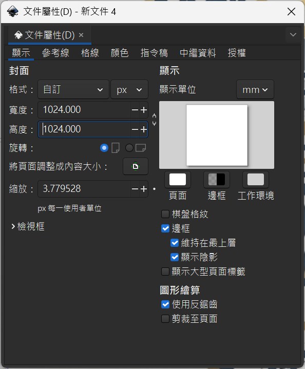 按 Ctrl + V 貼上剛才從 Krita 複製的圖片。或是去插入圖片,這時候由於一定不是 768 x 576 px, 先對齊內容與inkScape 畫布的左上角, 點擊 File -> Document propertites, 設定為新的大小.